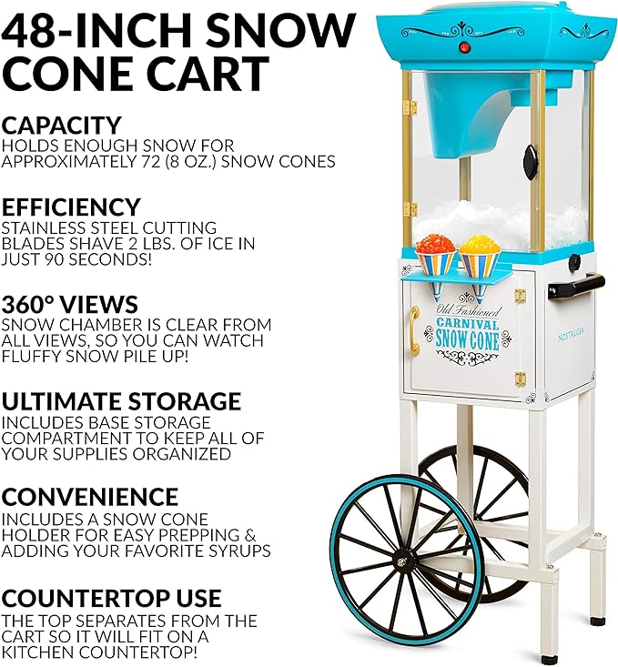 Snow Cone Shaved Ice Machine - Retro Cart Slushie Machine Makes 48 Icy Treats - Includes Metal Scoop, Storage Compartment, Wheels for Easy Mobility